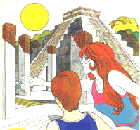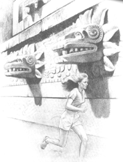 After retrieving her belongings from backstage, Sra. Mendez invites the girls on an outing the next day to the Pyramid of the Sun. At the site, Bess helps a tourist who feels faint while ascending the pyramid steps. After descending, Nancy grabs George's arm and points to a man rounding the corner, identifying him as Enzo. The girls take off in pursuit.