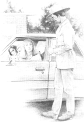 The girls start their road trip and make a pit stop where the people speak no English and all the food is full of spicy peppers. After four days, they arrive at the border, where the customs officer accuses Nancy of trying to smuggle a stolen jade figurine into the U.S. A box is found in the trunk, and another customs officer calls the police in Mexico City to vouch for Nancy's character. Upon arrival in L.A., all the hotels are booked, so the girls call on George's former neighbors, the Vetters, for accommodations. While making the phone call, the car is stolen.