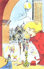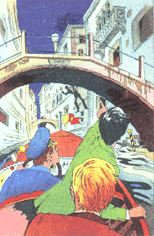 Nancy contacts the duchessa to arrange for her to meet the boys. The duchessa hangs up on her saying that she has no need to talk to her again, but her phrasing is awkward, and Nancy suspects she meant to convey just the opposite. The gang takes a gondola ride and Nancy thinks she sees Erminio in a passing window. Their gondola falls in with a tour group and they can't get their gondolier to stop at the duchessa's.