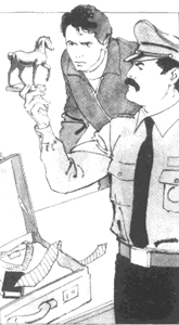 There is a loud knock at the door which wakes the girls - it is the night clerk from the hotel saying that the gondolier, Andreoli, thought the girls might be in trouble. Nancy explains their story and says they plan to tell the police the following day. Next morning it is raining, and the girls notice that the shop (called Artistico Vetro) has a broken window. The concierge hands Nancy a note, but it is illegible as the rain has made the ink run. The girls go to the police station, accompanied by an interpreter. They are allowed to see the boys, who recount their story of being detained at Marco Polo airport and having their belongings thoroughly searched. The customs officials found a glass art piece (an abstract figure of a horse with golden hooves) in Ned's suitcase. The item was dropped by the official and it broke. Nancy identifies herself to the police, and they connect her to the break-in at the glass factory.