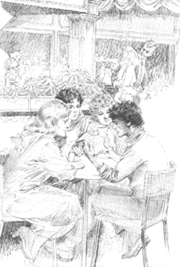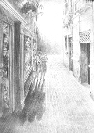 Nancy thinks she sees the duchessa in the storeroom, but is told she never comes to the factory. The group goes to the showroom where Nancy notices a recent order with Filippo's winged lion "signature." The showroom manager, Mr. Chiais, offers to show them some pieces and escorts the group out when they start asking questions. Nancy decides to watch the factory as it is nearing closing time; she wants to see if the duchessa emerges. They have no luck and return to the hotel, where the duchessa calls and arranges a meeting in Murano at 10 PM that night. Nancy considers whether or not the meeting is a trap. George suggests that she accompany Nancy as her gondolier.