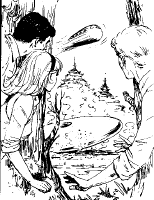 Nancy awakens to find herself back at Dismal Swamp with Shoso kneeling by her, trying to get her to chew a bitter leaf. The saucer is gone. Ned is also revived and they exchange stories about their amazing dreams, then speculate that some kind of gas from either the swamp or the saucer caused them to black out and hallucinate. They find a scorched area in the swamp where the saucer had set down and dig up a sample to take back to camp, which they place in Susan B's saddlebag. On the way back, the Nancy's horse goes out of control.