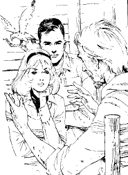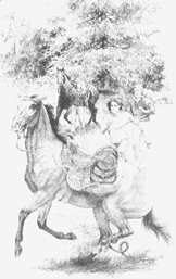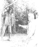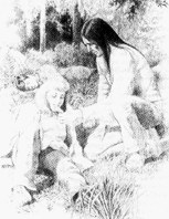 Nancy and Ned use a friendly approach with the man and are able to communicate their names using sign language &endash; he is called Shoso. He indicates that some of the horses were scared by the wind storm and have run off. Included are the pack horses which were carrying all the camping equipment and the food.
