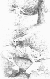 Dave cannot reach Bess in time to stop her from tumbling into a stream with jagged rocks, but a dog comes in the nick of time and stops Bess's progress. It is determined that the lifesaver is Joe's dog, Trixie &endash; the group follows her to the cabin, leaving Bess and Jan behind with a walkie-talkie. Later, Bess reports seeing a "giant" Indian who is dressed in leaves. The group conjectures that the creature might be connected to the UFO. When the group is preparingt heir dinner of fish over an open fire, a large gusting wind blows over their spit.
