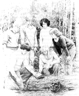 The boys manage to get the trunk turned over and can see the Indian face; they then drag the piece to a safe place where it will not get burned during the forest fire, then the group goes to help fight the fire by digging backfire trenches. After being thanked by the forest rangers for their efforts, the group returns to the log and removes the carving of the Indian head. Beneath they find a metal box inscribed to Joe.