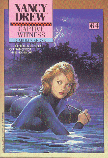 Wanderer "Arch" cover by Ruth Sanderson (left): page 169 - leaving the theater in an 1880s gown to meet Eric; Nancy and Eric hide in the pilings after changing into scuba gear, waiting for the audience to disperse when Gutterman calls out that Nancy Drew is urgently needed for a message, but Nancy doesn't fall for the ploy; Nancy should be wearing a dark wig. Scholastic cover by Kinuko Craft (right): same, except Nancy is wearing the dark wig with ringlets. Note title has been changed to "Captive Witness Mystery." |